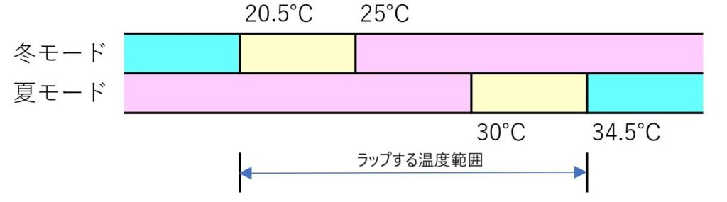この時期だと「冬」でも「夏」でも、どちらでも動いてしまう事があって「壊れているのではないか?」とお問合せをいただく事も多いのですが、動作する温度帯がラップしているので、このような動きになってしまいます。決して壊れているわけではないので、ご心配なきように!