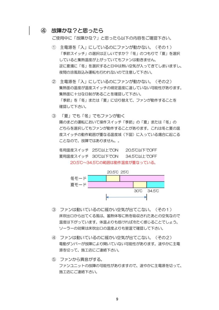 「冬」へ切り替えるタイミングについては、朝晩が寒いと感じるようになってきた頃で良いと思いますが、それはお住いの地域によって大きく異なります。その判断は、ご自身の肌感覚で決めていただくことになりますから、色々と試してみて下さい。例えば今日「冬」に切り替えて集熱空気を取り入れたとしても、いきなり室温が急上昇とはならないでしょう。窓を開けていれば暑さが気にならないようであれば、それで良いと思います。まだ早かったと思えば、前述のように「切」という選択も有りでしょう。その時の気候の状況に応じて服を着たり、脱いだりするのと同じように、ご自身の肌感覚に合わせてスイッチを操作してみて下さい。