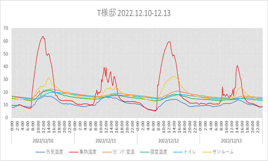 上記のデータも、集熱パネルの設計者としては「最も太陽が弱くなる時期にしっかり応答してくれた」という集熱性能を確認できた点は嬉しかったですが、重要なのは「63℃という熱が室内に入って何をしたのか?」という事なのです。そこで室温のデータを見てみると、終日20℃前後で緩やかに変化していました。気温が最も低い朝の5~6時頃でも、それくらいの室温を保持できたというのは、前日の集熱がしっかり働いていて、建物の保温力が確保できてる証と言えるでしょう。お施主様が希望された「冬を暖かくして欲しい」は、叶えることができたかなと思います。