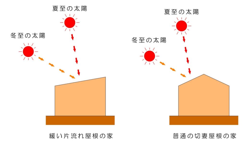 一方で夏の太陽は、高い位置から降り注ぐので、勾配が緩いと、これをもろに受ける事になります。左の片流れ屋根の家は、ほぼ直角に日射を受けているので、屋根全面が強く加熱される事になるでしょう。その熱の行方は、前述のとおりです。これが切妻屋根であれば、まともに日射を受けるのは南半分だけですから、室内への影響もかなり緩和されると思います。