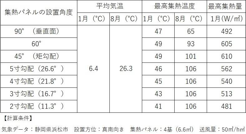 上の表は、集熱パネルの設置角度で、集熱温度と集熱量がどれくらい変化するかを計算で求めたものです。