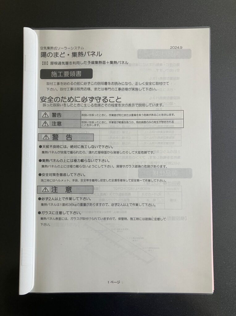 各現場には、製品と共に↑施工要領書が届けられています。集熱パネル、ソーラーファンボックス、ダクト、試運転要領といった冊子がクリアファイルにまとめられていて、職人さんが自分に必要な資料だけを持っていけるようにしてあります。