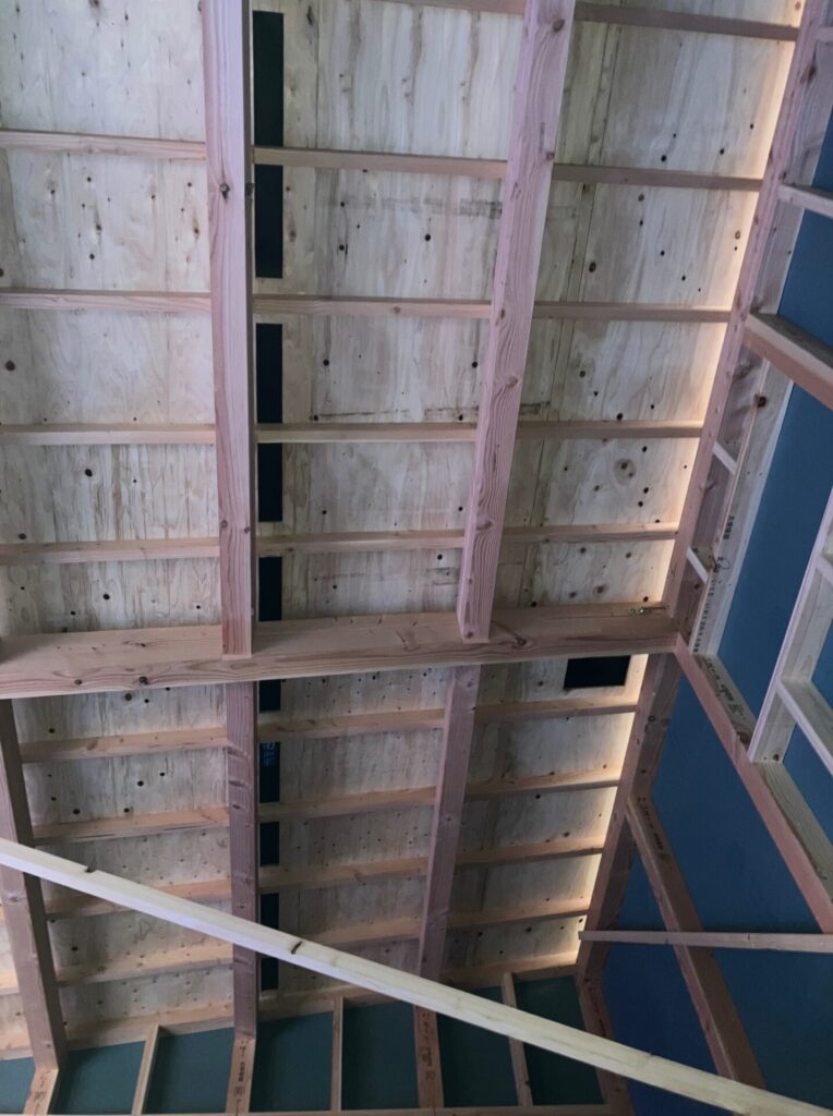 屋根の集熱面工事が終わったら、室内におけるダクティングとソーラーファンボックスの設置工事です。