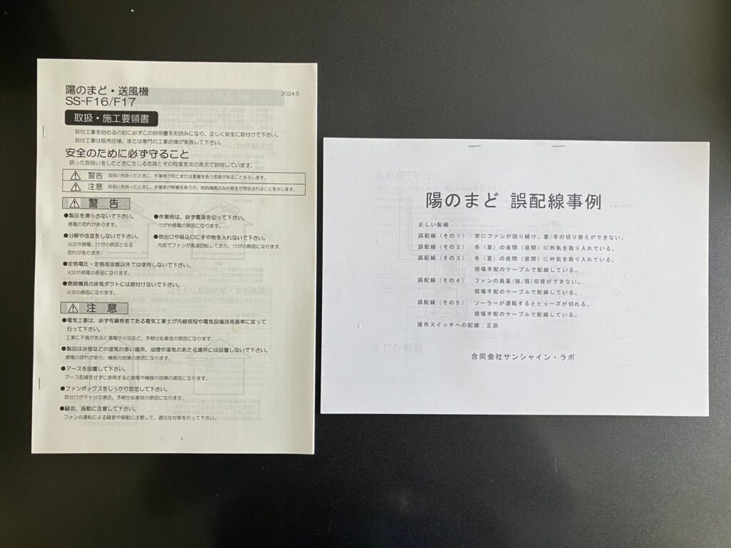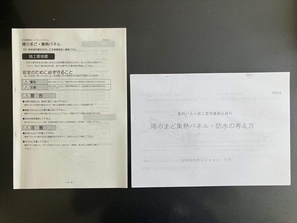 各現場には、製品と共に↑施工要領書が届けられています。集熱パネル、ソーラーファンボックス、ダクト、試運転要領といった冊子がクリアファイルにまとめられていて、職人さんが自分に必要な資料だけを持っていけるようにしてあります。