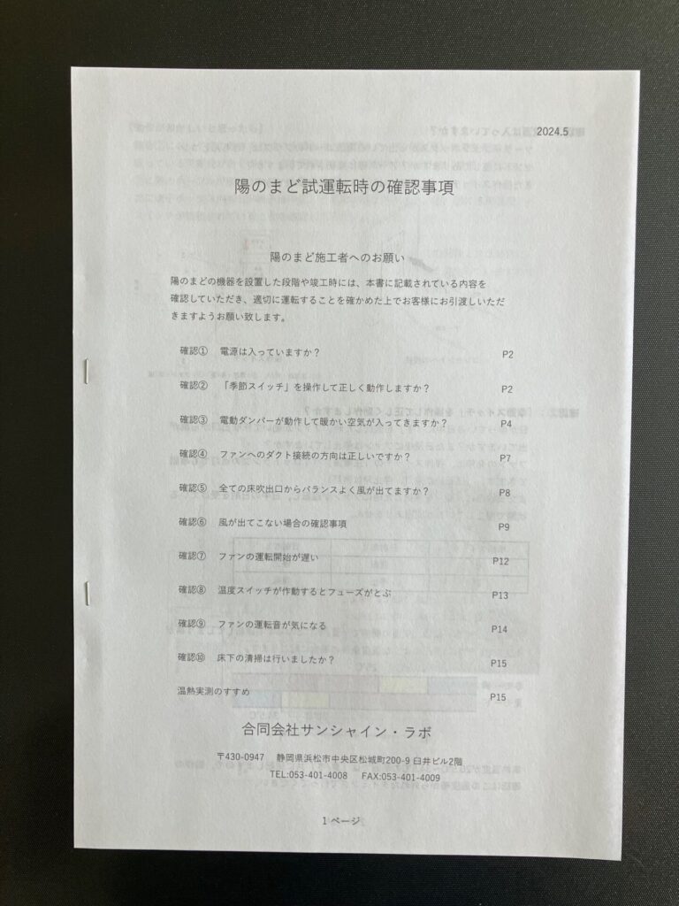 そして最後に完成したら必ず試運転を行って、機器が正しく動作し、各床吹出口から空気がきちんと出ている事を確認してからお客様に引き渡していただくようにお願いしました。