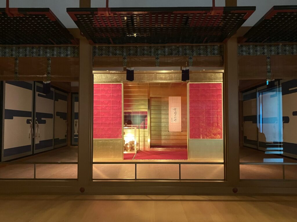 所長曰く、昔来たときは、エントランスホールから本館まで長いエスカレーターで登ったけど、それがすごく幻想的だったのだそうです。しかし今回は駐車場の関係で、一番高い所(3F)から入場する事になりました。そんな訳で最初に見学したのが豊臣秀吉の「黄金の茶室」です。