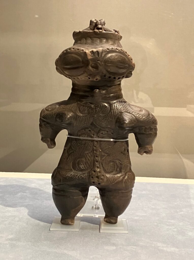 2つめは、北海道函館市の著保内野遺跡から出土した「中空土偶(国保)」で、地元では「カックウ」という愛称で呼ばれているそうです。夏に青森~函館へ旅行した際にこの土偶に会いたいと思っていたのですが、時間の関係で残念ながら見学できませんでした。でもまさか京都で会えるとは!