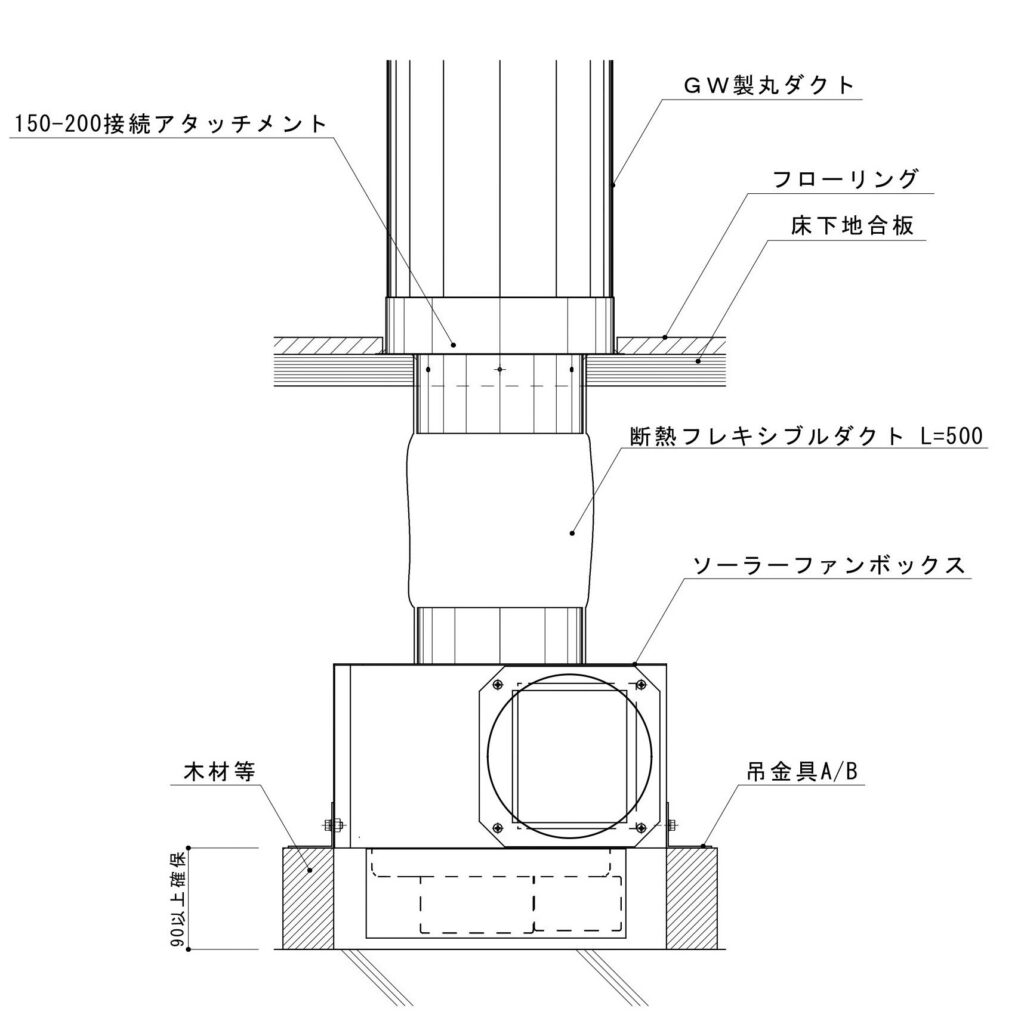 ⑧ ソーラーファンボックスを据え付け、断熱フレキシブルダクトを接続します。