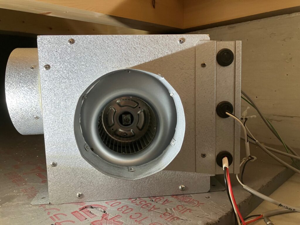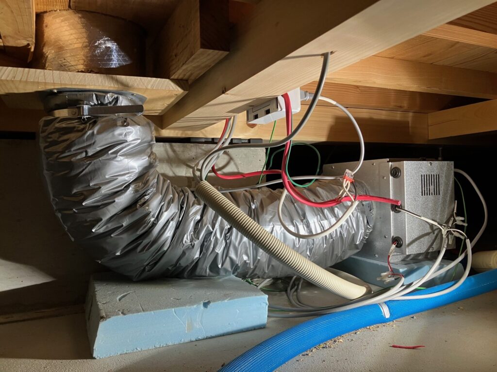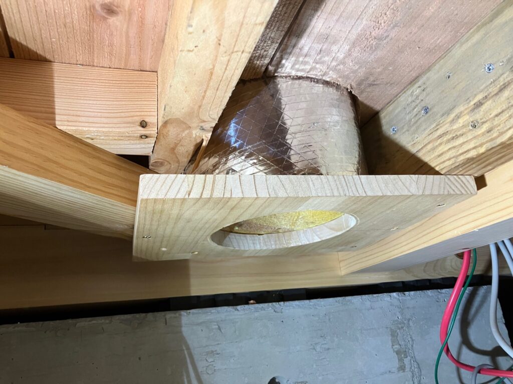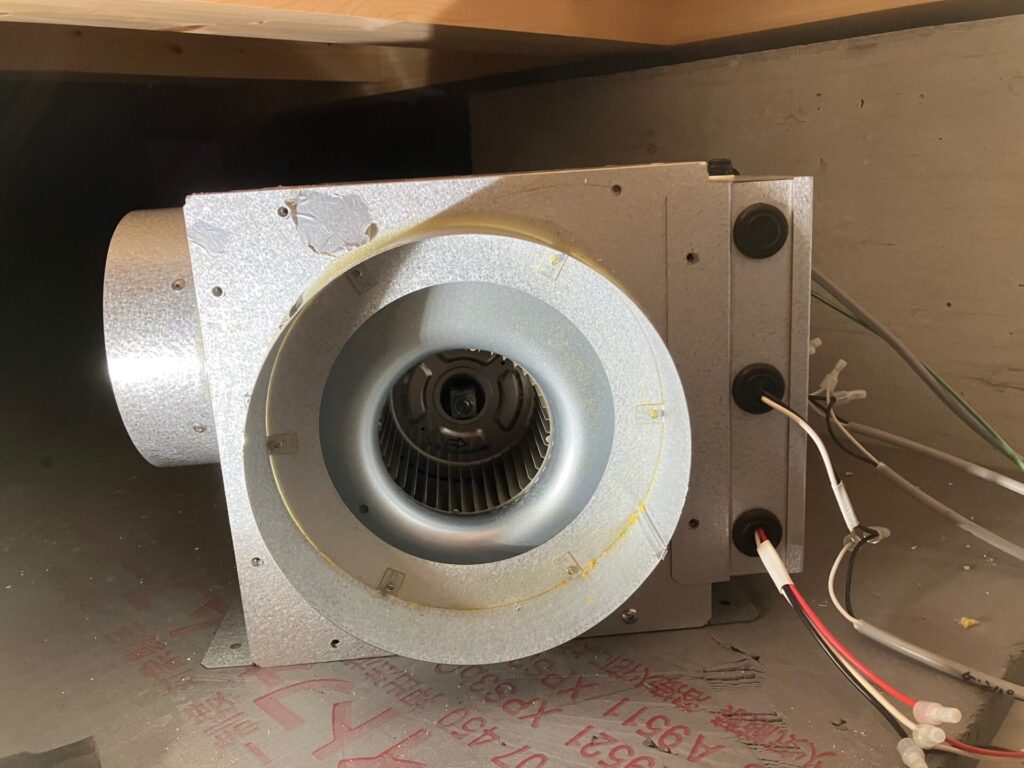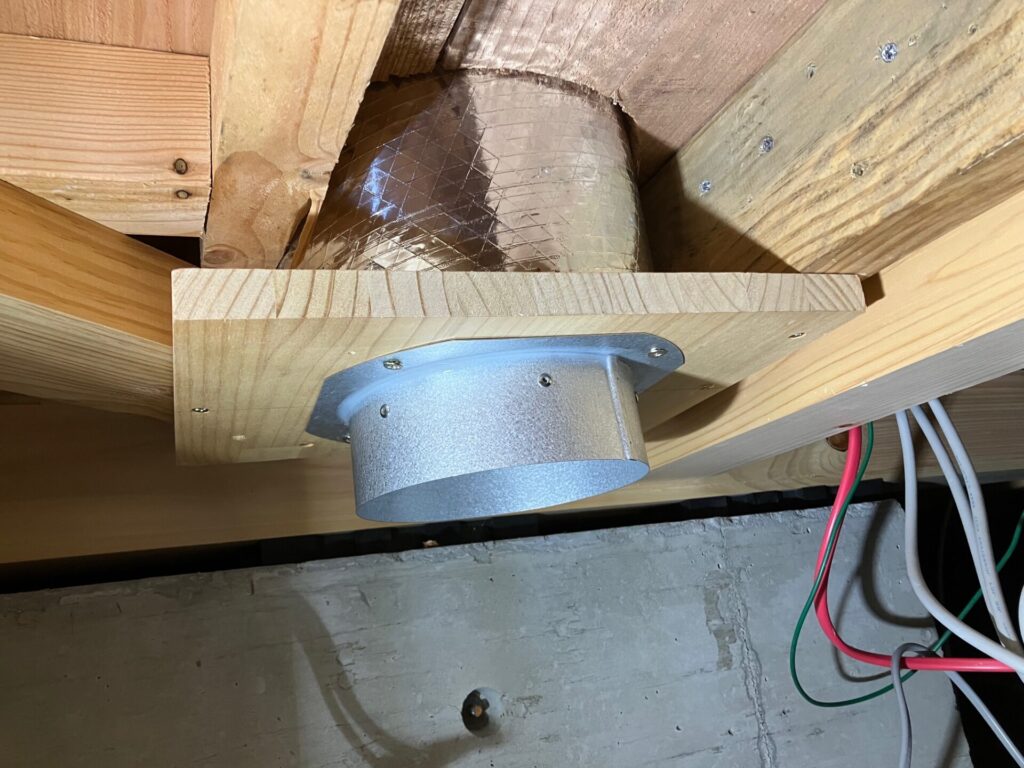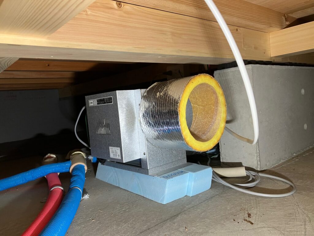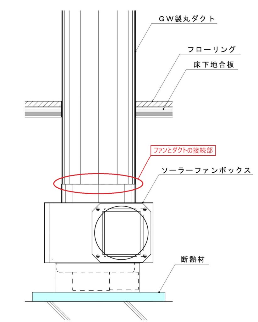 床下にファンを設置する場合は↓のように立下りダクトとファンをダイレクトに接続させない納まりが良いと改めて思いました。あと床下点検口は、ファンの近くがいいですね。腕と背中がマヒしています。(笑)
