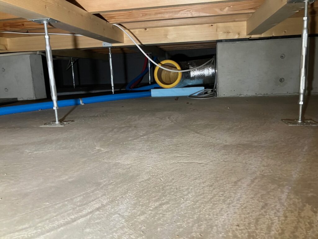 今回は床下に潜って、実際のファンの据付け状況とダクトへの振動、騒音の伝わり方を確認します。前回訪問時には諸事情から床下に入れなかったので、施工関係者からの聞き取りのみで問題点を考えて対策部材を準備してきましたが、果たして想像通りの状況なのか、まずは潜ってみることにします。