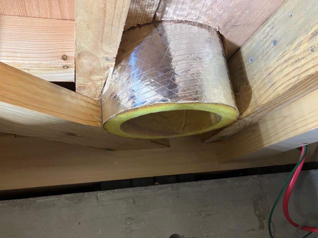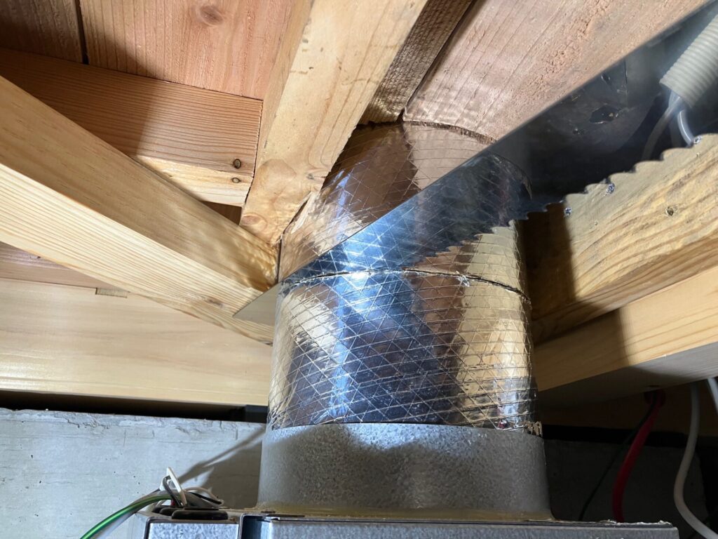 断熱フレキシブルダクトを使用することによりファンの運転振動が吸収されて、立下りダクトへの伝わりが抑えられました。ファンの吐出口に①で切断したダクトの残りを取付けたところ、風の音が小さくなったので、これも効果的です。