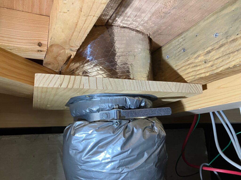 ⑤ ダクトカラーに断熱フレキシブルダクトを被せ、ダクトバンドで固定しました。