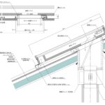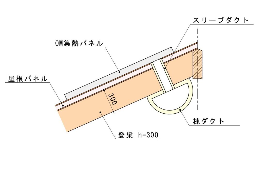 標準の登梁のせいが300mmあり、その下面に半円形棟ダクトを取付けると長いスリーブダクト群を集熱パネルと接続しなければならないという非現実的な納まりになってしまいます。集熱パネルも棟からかなり下がった位置に設置されることになるので、従来の仕様ではスマートなOM集熱面にならないと思いました。