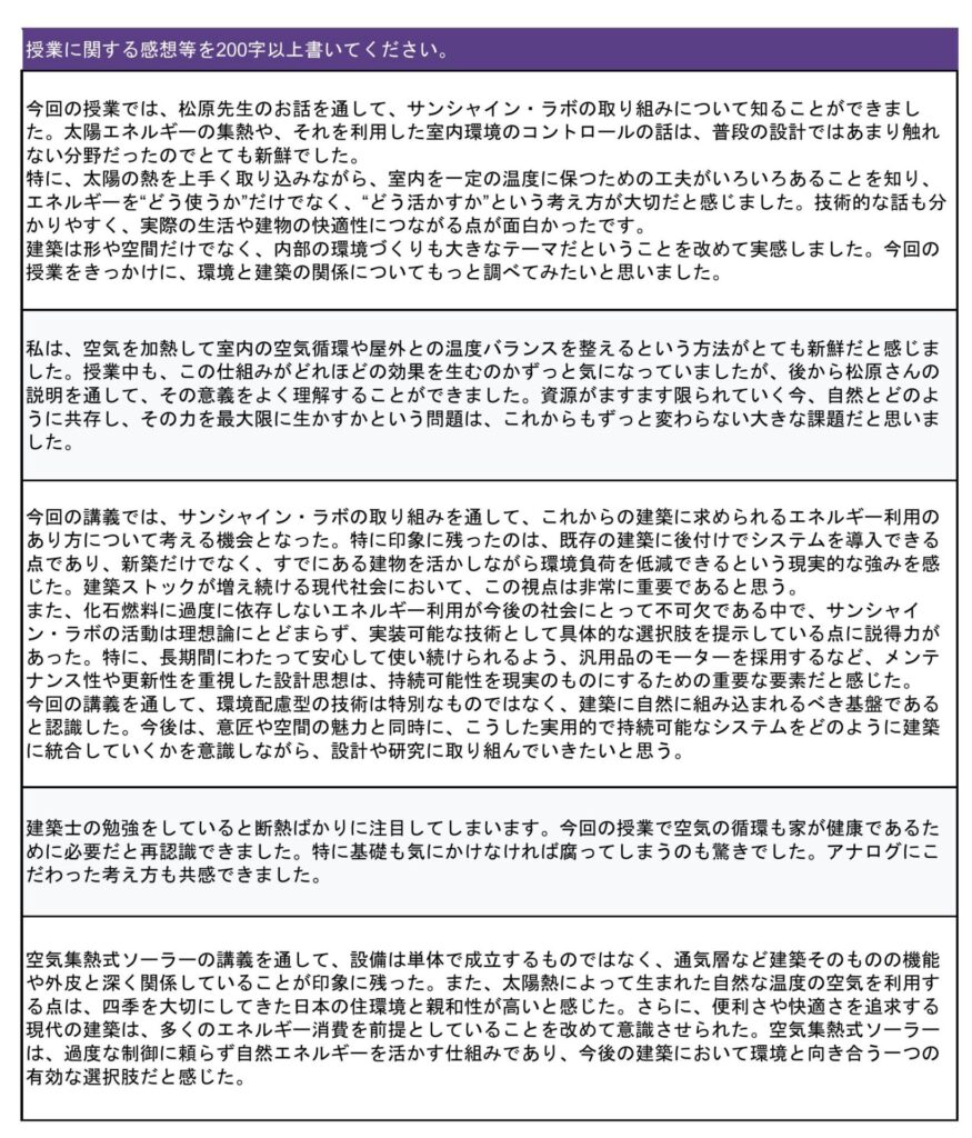 先日、還暦を迎えたばかりの私などは、あと10年~20年くらいでこの世のステージを下りる事になるので、その間に「何事もなければいいや」くらいしか思っていませんが、子供や孫の時代を想像すると気の毒に思えたりします。もしそういう事が想定されるのであれば、今から出来る事を始めて行くべきではないのか?というのが、今回の私の講義の大きなテーマで、そういう中で空気集熱式ソーラーが果たせる役割は大きいものがあるという事を話しました。90分という長そうで短い講義の中でどれくらいの事が受講生に伝わったかわかりませんが、彼らが社会に出た時に今回の話を思い出して「持続可能な建築を実現して行ってくれたらいいな」と思います。