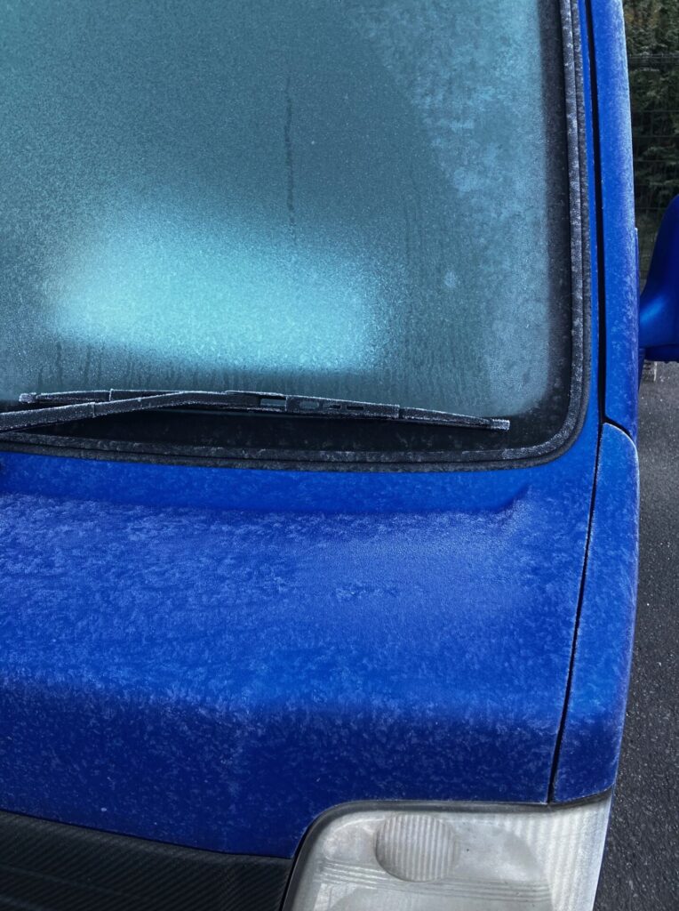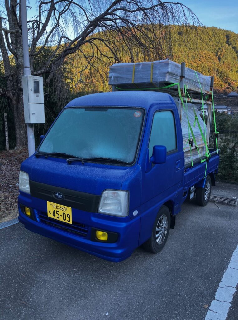 ホテルをチェックアウトし、現場へ向かおうと思ったら、霜が降りて青トラのフロントガラスが凍っていました。浜松では滅多にない事なので、珍しいと思って写真を撮ってしまいましたが、この解氷で10分のロス。でもこの感じでは、現場の屋根も夜露で濡れていて、設置作業が出来るのは昼近くになりそうだな。