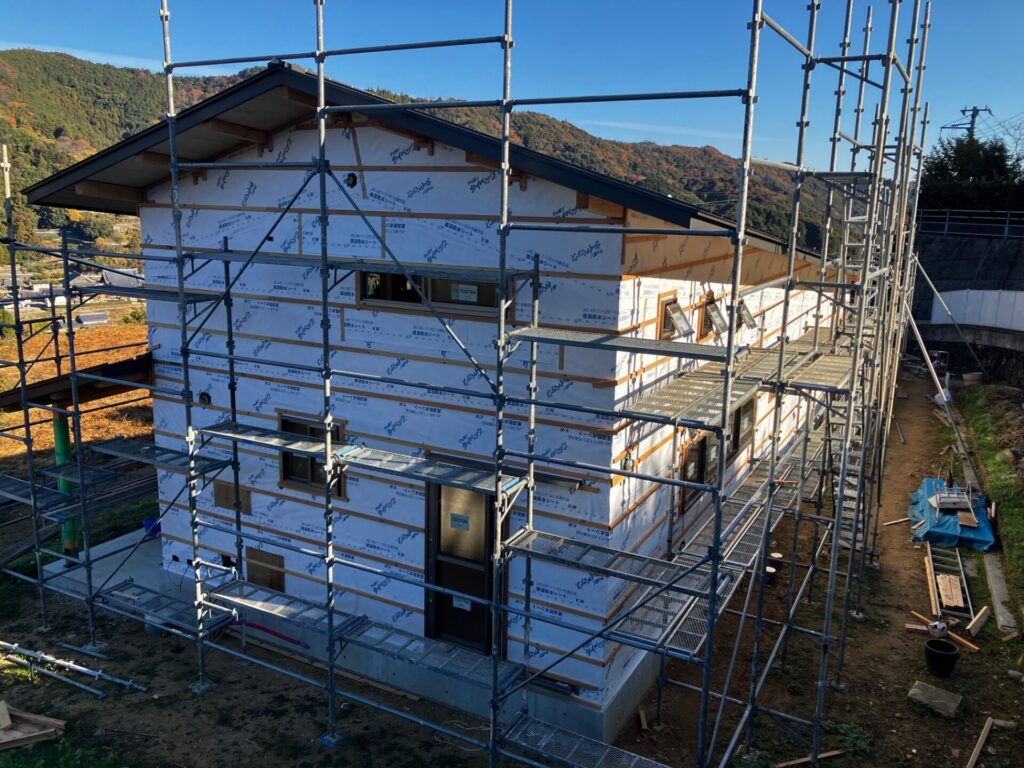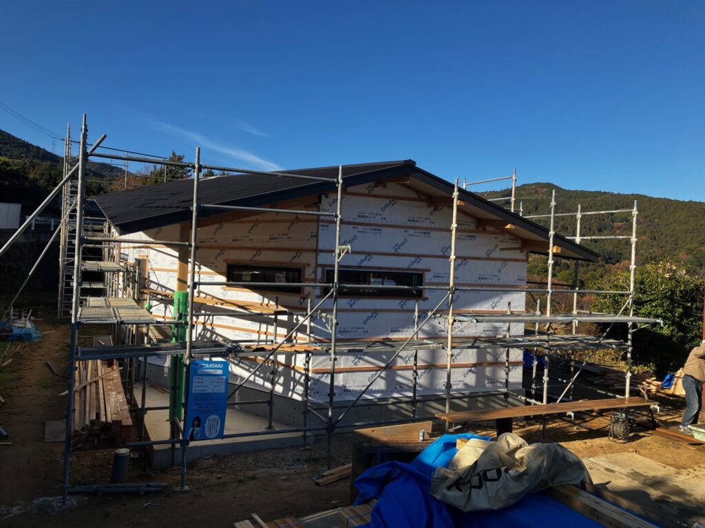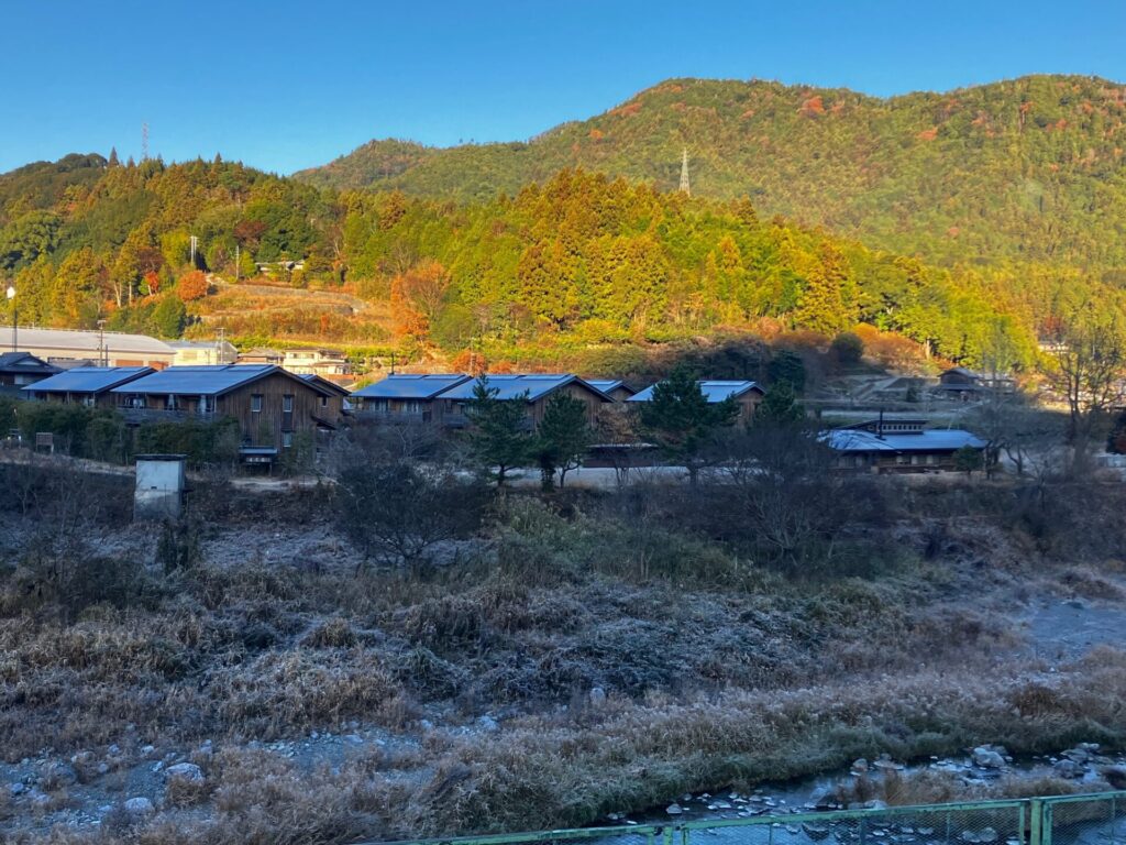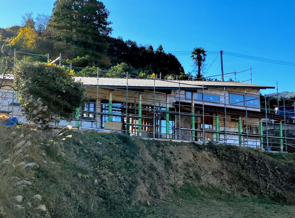 今年最後の出張先は、徳島県の佐那河内村で建築中の住宅に陽のまど部材をお届けし、集熱パネルの設置工事に立ち会う事でした。移動の様子はヒノム研究員がブログに書いていますのでここでは省略しますが、今回は物量が多かったのでなかなか大変でした。納品&施工指導の前日は、久しぶりに神山温泉に泊まり、大きなお風呂でガチガチに凝り固まった身体を癒しました。朝食の大きな味噌汁も楽しみの一つ。何とか今日の施工指導がこなせるくらいの体力を回復させることができました。