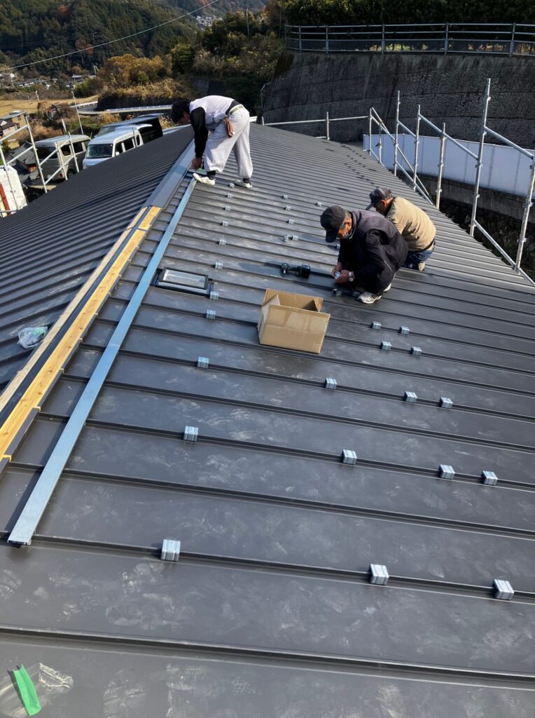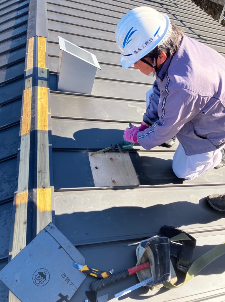 私が現場に到着した午前8時半の時点では、まだ屋根に日が当たっておらず、夜露でびしょびしょに濡れていて、すぐに作業が始められる状況ではありませんでした。9時過ぎ頃から日が当たり始めたので、今回の工事で一番不安に思っているダクト接続ボックスの工事を行いました。