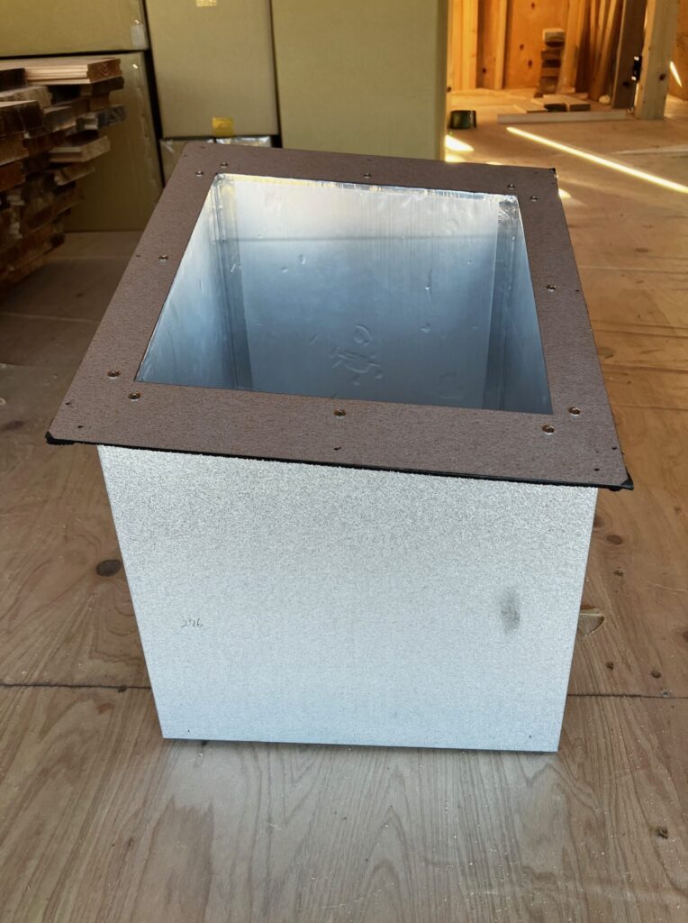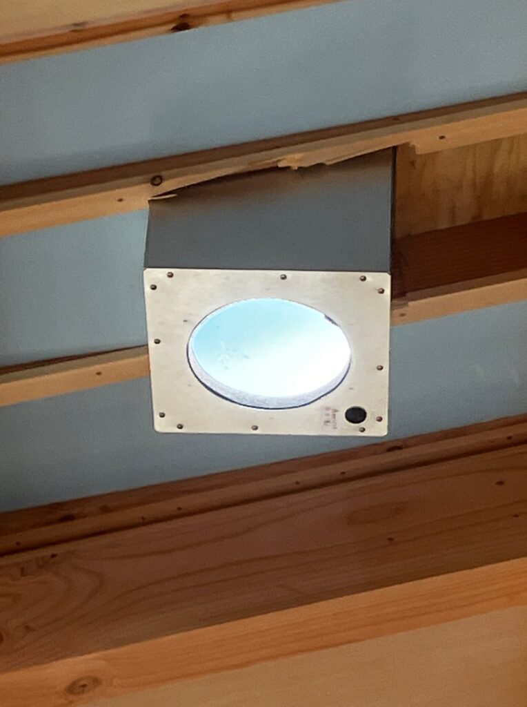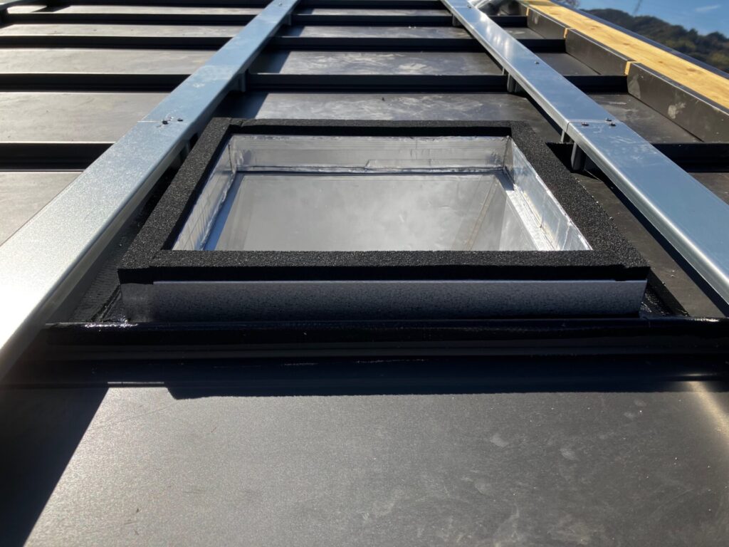 嵌合立平葺き屋根の中に開口を設けて、そこにボックスを落とし込む形なので、垂木や断熱材との干渉部分を調整しながら、何とか上手く取付けることができました。寸法も角度もバッチリで、祝杯をあげたい気分ですよ!