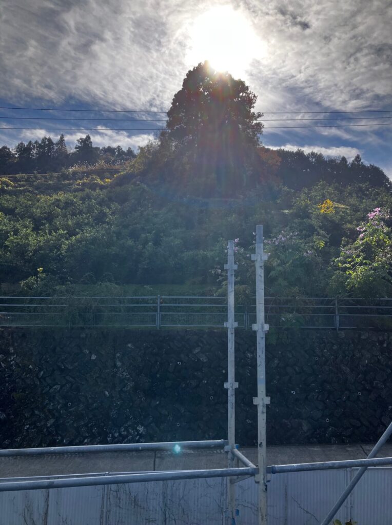 施工中に気付いたのですが、お昼12時のタイミングで集熱パネル設置予定位置に大きな陰が出来ていました。その原因は南の山の中腹に立つ1本の高い木。冬至なので陰が長く伸びるから仕方がないけど、お日様パワーが最大になるこの時間に陰の影響を受けることになるとは想像していませんでした。知っていたらもう少し西か東に配置するんだったけど、立下りダクトの位置を指定されてしまったから、この状況も仕方がないか。