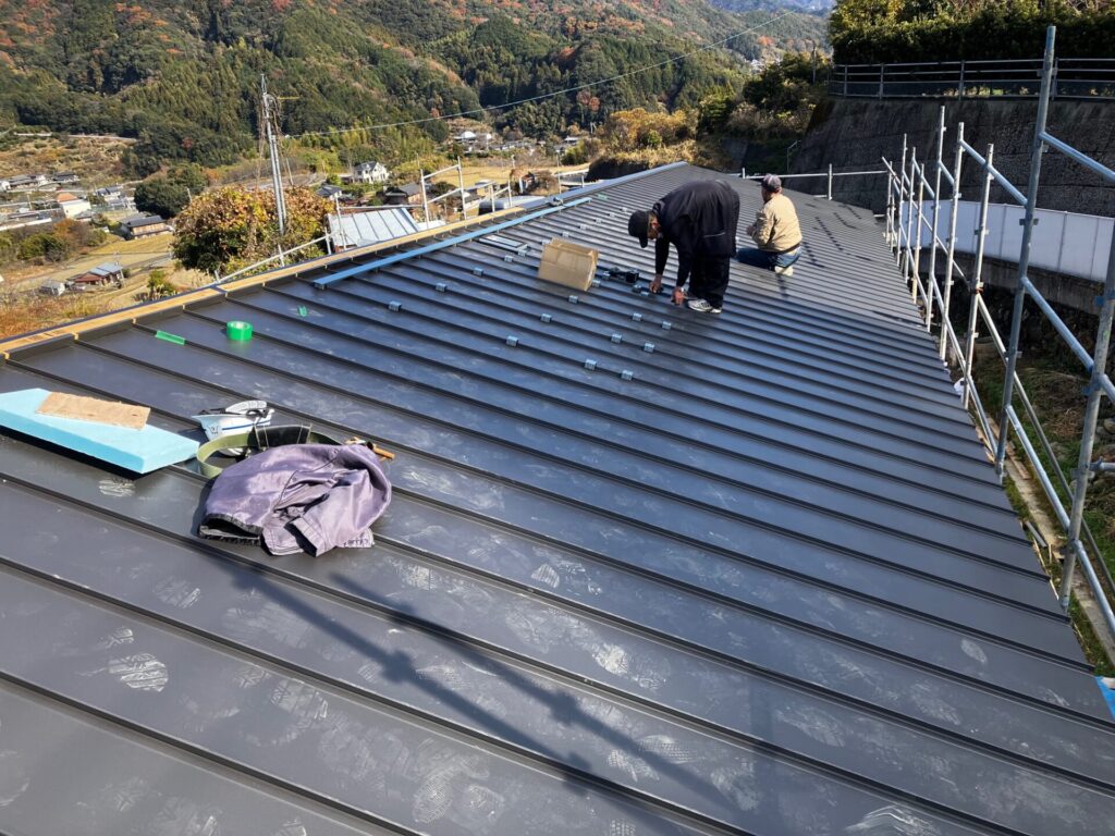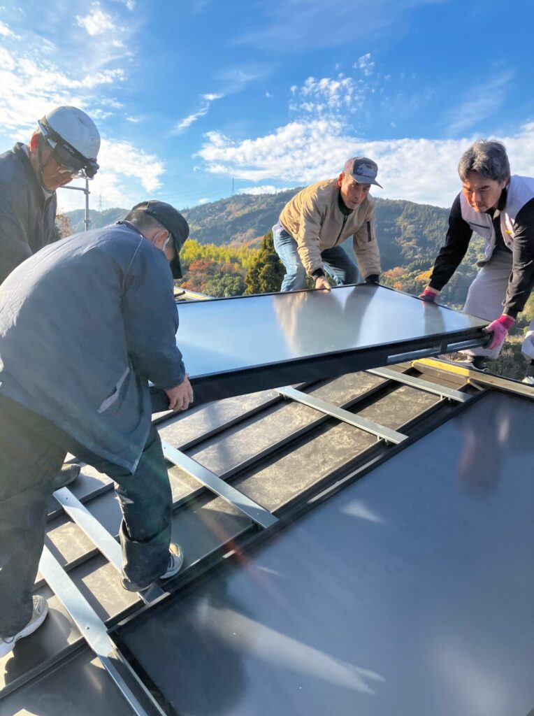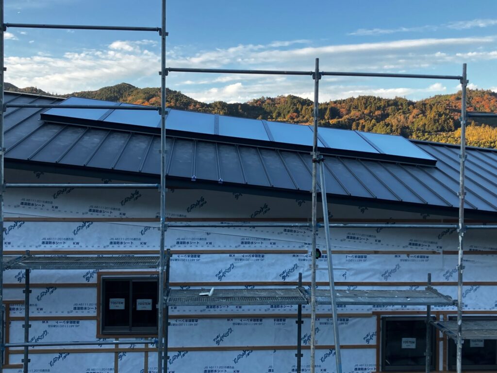 棟と嵌合立平葺き屋根材が直角ではなく、わずかに東に振れていた為、棟に平行に架台を配置すると集熱パネルがレールから外れてしまうという状態になってしまい、この修正にかなり時間を取られてしまいました。集熱面が完成した時点(15時半頃)で屋根は完全に陰で覆われてしまい、山間部では日照時間が短くなってしまうことを改めて実感しました。床面積40坪の家の場合、通常は集熱パネル5枚くらいで計画するのですが、今回は集熱パネルのみでの集熱になる事と日照時間の短さから、得られるときにできるだけ多くの集熱が出来るようにしようと考えて、集熱パネルを7枚にしてみました。果たして期待通りの効果が得られるかどうか、不安であり、楽しみでもあります。
