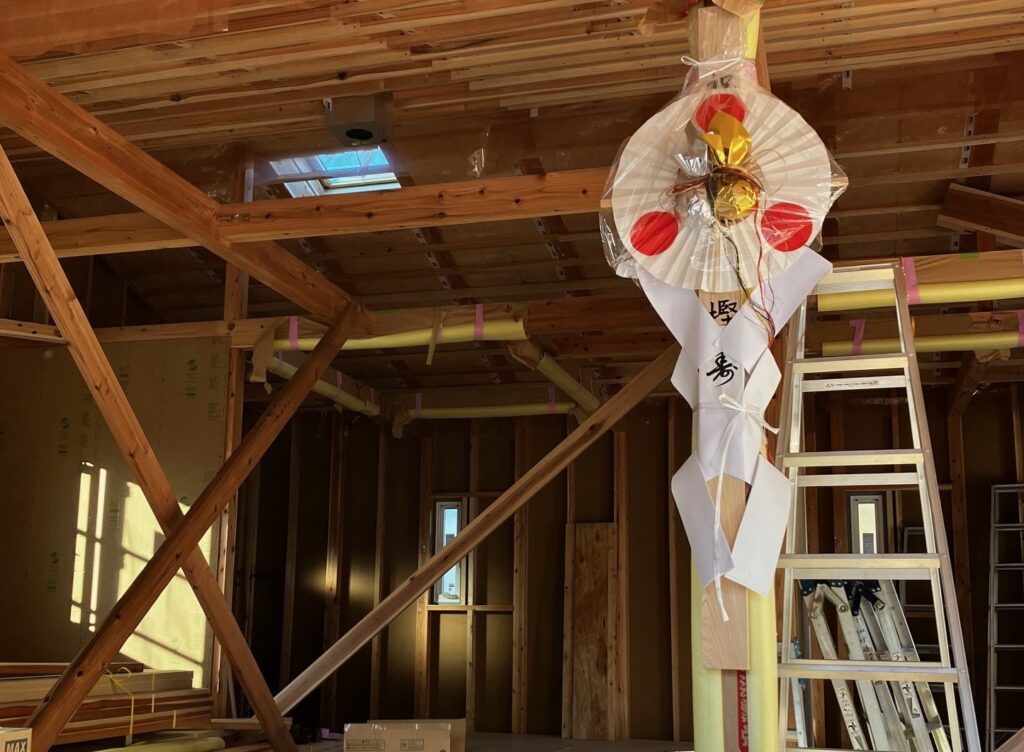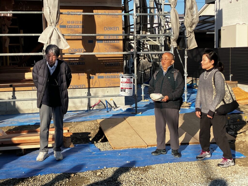 和秋建設さんの現場では上棟日に納品を依頼される事が多かったので、これまでにも何度か上棟式に参加させていただいています。工事中の安全と無事の完成を一緒にお祈りさせていただきました。