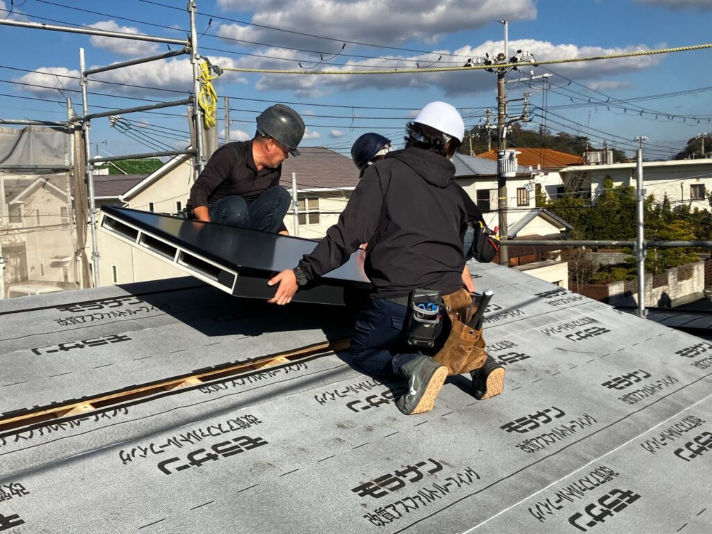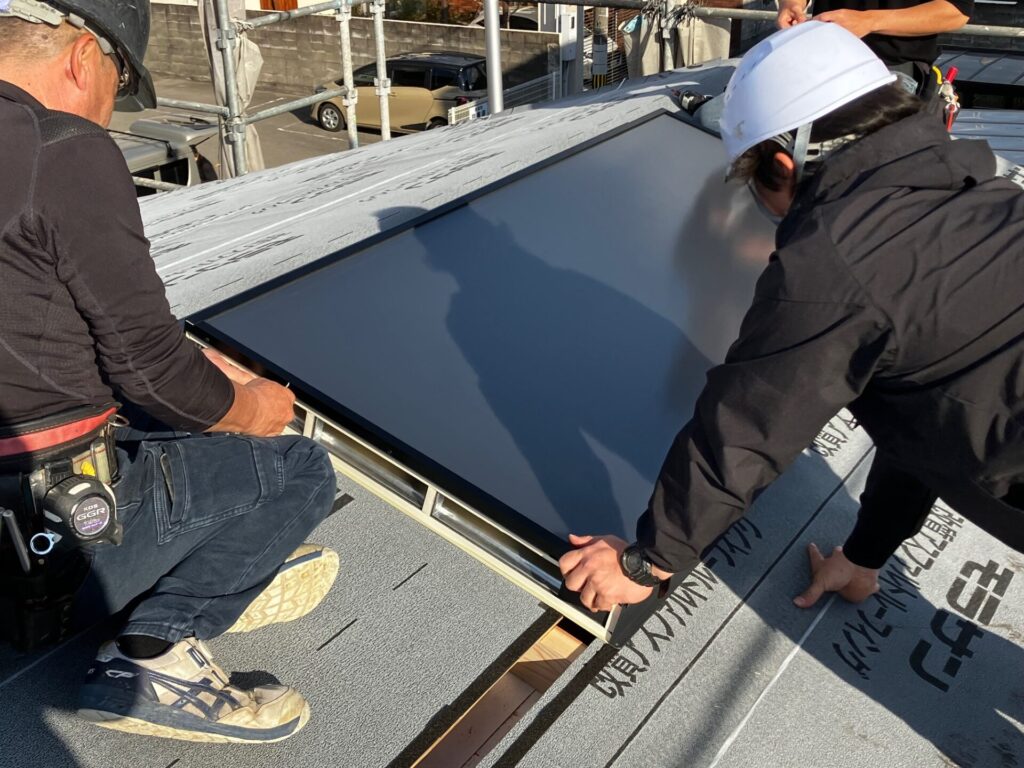 和秋建設の職人さん達は、慣れたものでどんどん作業を進めて行き、あっと言う間に4枚のパネルが設置されました。四周の防水テープ処理から水上側止水板の取付けまで終えたところで時刻を確認すると15時10分。納品してから1時間足らずで集熱面工事が完了しました。各職人さん達が仕事の段取りをしっかり理解していて、無駄な動きが無いからこそ、このようなスピードで完成出来たのです。