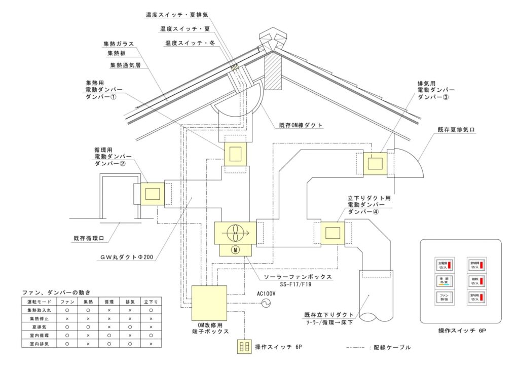 送風機は、建物規模に応じて陽のまど用ソーラーファンボックスの「SS-F17型」あるいは「SS-F19型」を使用し、最大4台の電動ダンパー(集熱、循環、排気、立下り)をそれぞれのダクト経路に配置して、温度条件に応じて流路を切り替えるようにします。今回つくった「OM改修用端子ボックス」は、バイメタル式温度スイッチとの組み合わせによりOMの動きと同じ動作をさせることができるのです。