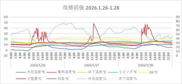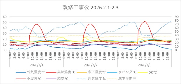 回収したデータをエクセルの表で確認しました。家に入った時に「おっ、暖かい!」と感じた期待値ほど、データの数値に劇的な変化は見られませんでしたが、まあ短期間に蓄熱が回復する事はないので、徐々に差が出て来るでしょう。ただ明らかに違うのは、改修前は各室の室温がバラバラだったのですが、改修後はまとまった感じで推移するようになったことです。